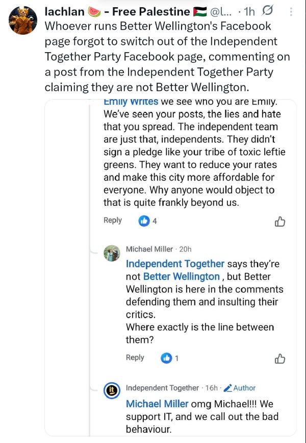 In Wellington there’s the Independent Together Ticket - well what’s left of it. When Better Wellington - the astroturf group behind the formation of Independent Together, tweeted nasty comments about a candidate, using the R word amongst other things, IT candidate Paula Muollo decried it as unfair considering her co-candidates no longer had anything to do with Better Wellington - while Better Wellington continues to promote them as “our candidates” and as been snapped forgetting to switch social media accounts.