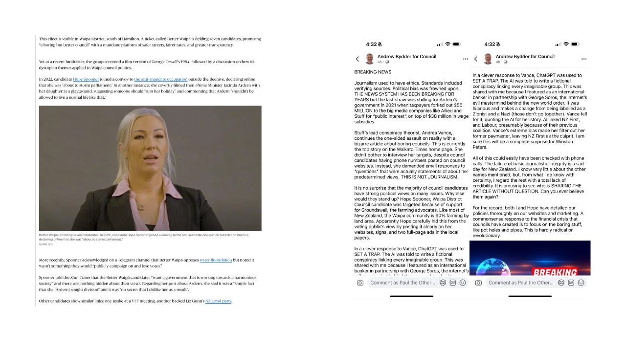 In Waipa, the Better Waipa team member Hope Spooner was approached by email (because this is the preferred method of ensuring questions can’t be misconstrued and it’s what VFF members were coached on asking for) by reporter Andrea Vance for a story in last weekend’s Sunday Star Times. She and Andrew Bydder, according to Bydder’s own Facebook update, used an AI to come up with a deliberately incorrect bio that links a bunch of conspiracies - like how George Soros controls the world, and sent that back as part of their response - along with blaming me for the beat up (I’ve never spoken to Andrea or the co-writer Charlie Mitchell). Bydder gloated on his social media how reporters fell for it - yet the article doesn’t mention the made up conspiracy or Bydder at all or his claims that there was a link between NZ First and Labour. They want to be trusted and still go out of their way to mislead - to own the media.