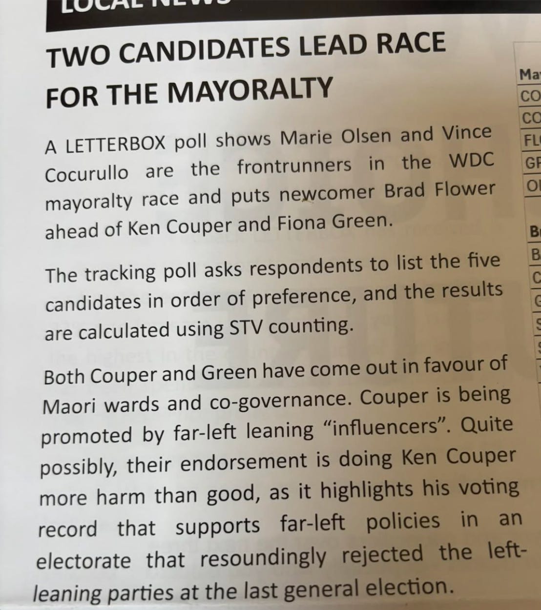 In Whangarei, Letterbox claimed to have run a Poll which showed, shockingly, the front runner was the Voices for Freedom member that editor Frank Newman sat by and supported as she launched her campaign with VFF Whangarei group C.R.O.W. and that other candidates were clearly being hurt by their far leftist policies - one of whom is a confessed paid up member of the National Party - so yeah, far leftist if you’re to the right of Act.